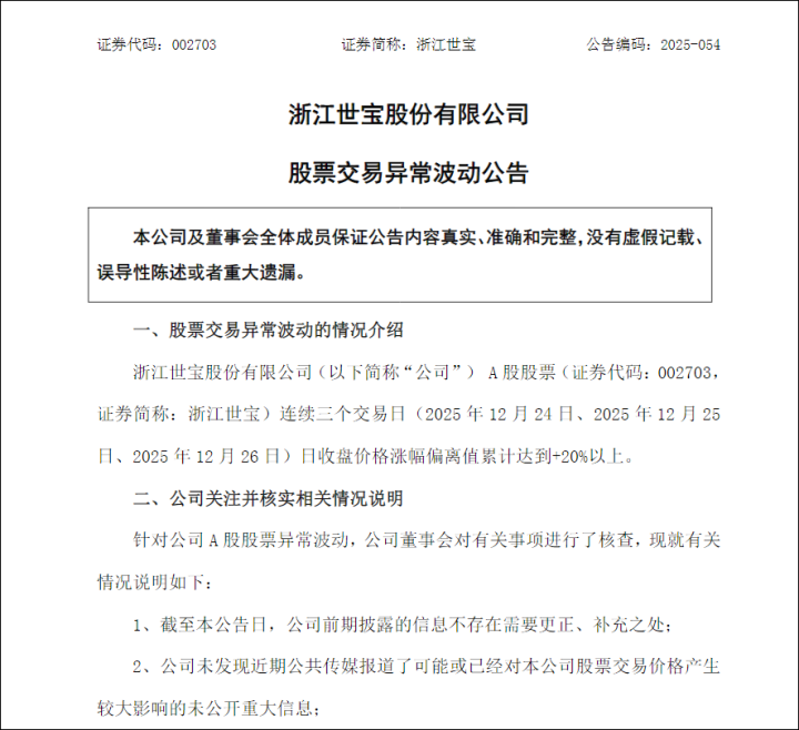 这是一只二度“9天6板”作妖的妖股。浙江世宝28日晚公告称,公司A股连续3个交易日(12月24日至26日)收盘价格涨幅偏离值累计超20%,公司核查后称前期披露信息无需更正补充,未发现未公开重大信息,经营正常,控股股东及实控人期间未买卖股票山东期货配资,无应披露未披露事项。