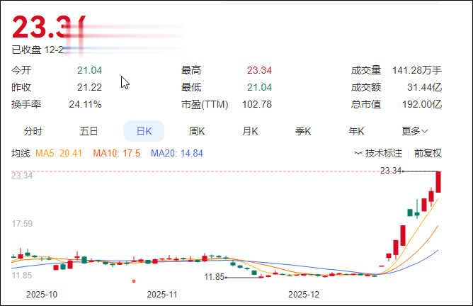 12月16日起,浙江世宝股价连拉涨停。截至12月26日收盘,浙江世宝股价为23.34元/股,在近9个交易日中6次涨停收盘。